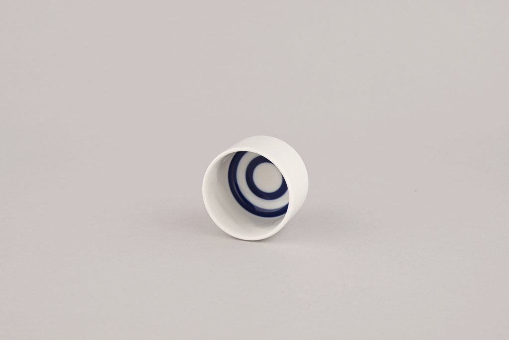The kikichoko is a cup used for sake tasting. A blue concentric “snake-eye” pattern is painted on the bottom; the white area is used to assess color, while the blue area helps evaluate clarity.