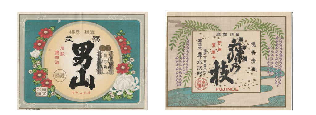 In this narrowed visual space, how could a brand stand out? Designers responded by simplifying imagery and emphasizing the brand name by framing it. In the label for Dokuritsu Otokoyama, for example, the name is enclosed within a circular frame, and Fuji no Eda in a square one, drawing the viewer’s eye through a clear “framing effect.”