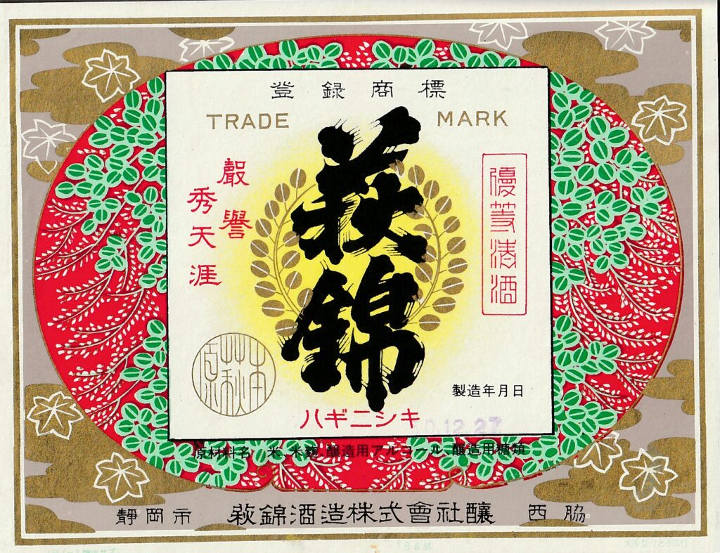 Brand: HaginishikiBrewer: Haginishiki ShuzoLocation: ShizuokaEra: ShowaContainer: Issho-bin(1.8L bottle)Printing Method: Mechanical printingSize: 15 x 12 cm