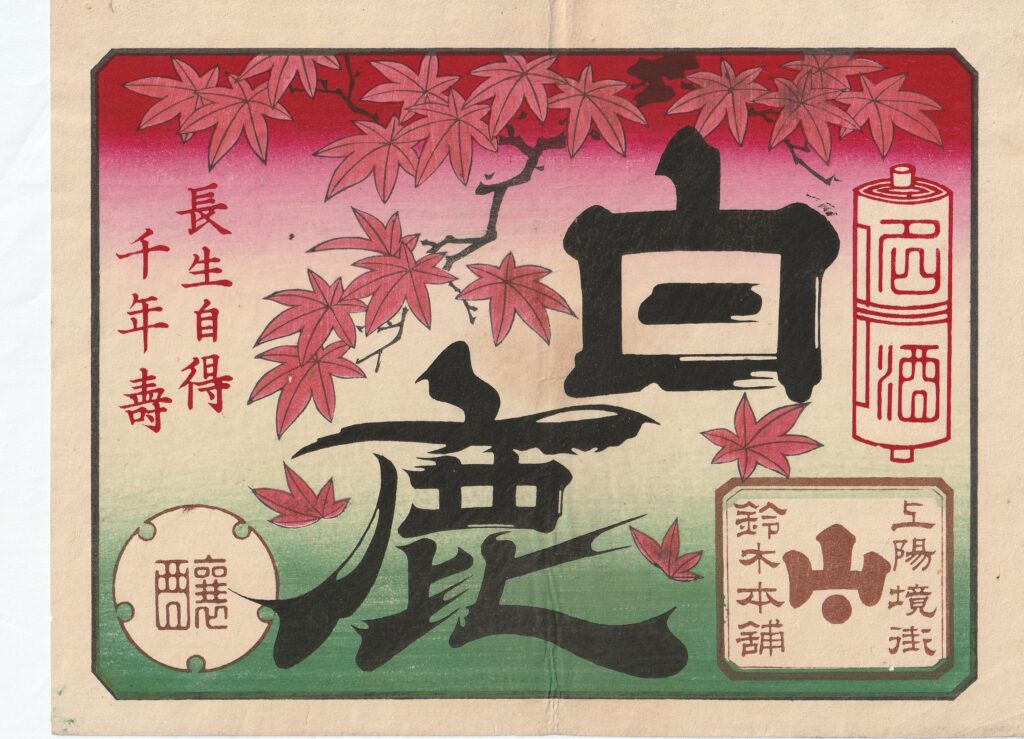 Brand: HakushikaBrewer: Suzuki HonpoLocation: GunmaEra: MeijiContainer: Wooden barrelPrinting Method: Woodblock printSize: 24 × 18 cm