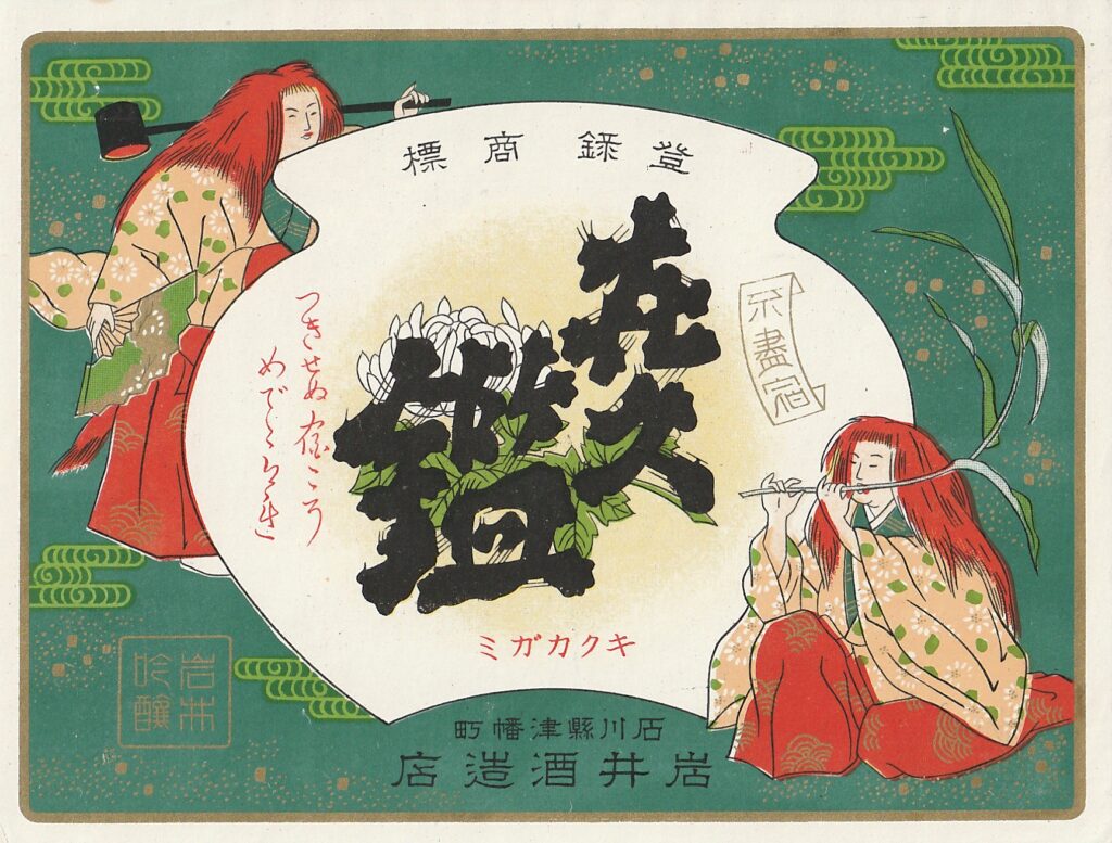 Brand: KikukagamiBrewer: Iwai SaketenLocation: IshikawaEra: ShowaContainer: Issho-bin(1.8L bottle)Printing Method: Mechanical printingSize: 15 x 12 cm