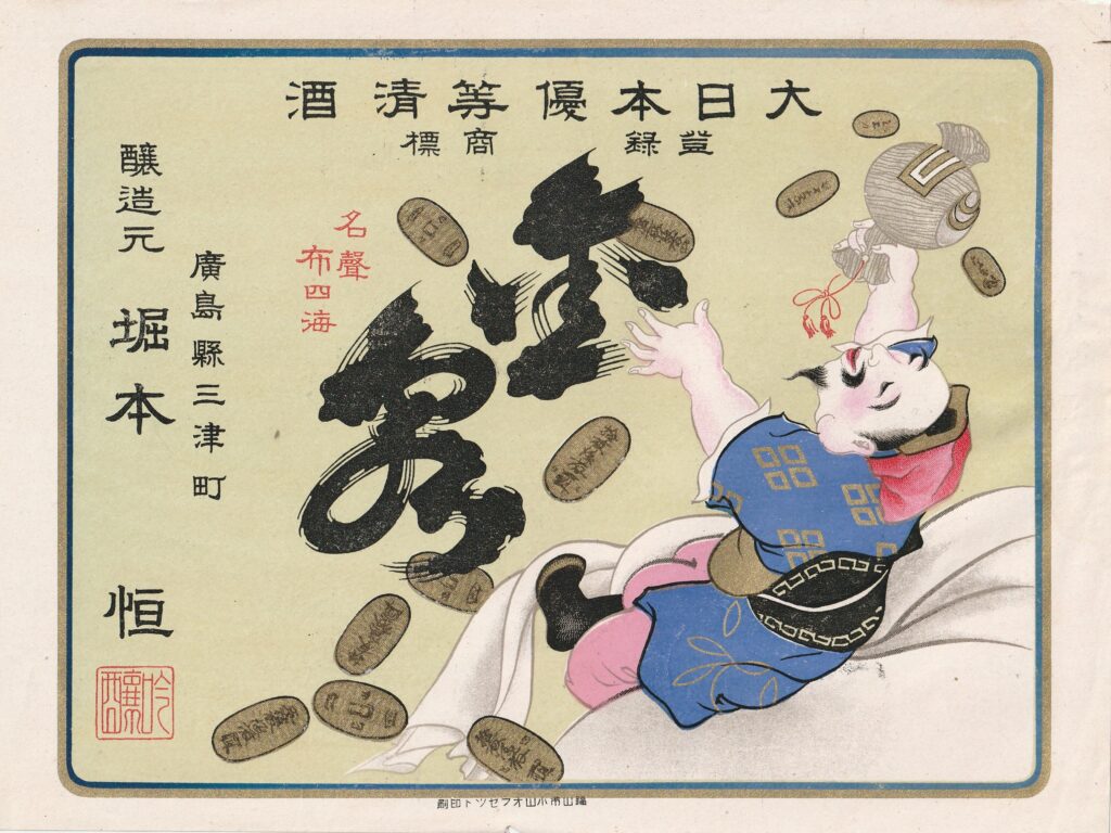 Brand: KinsenBrewer: Horimoto TsuneLocation: HiroshimaEra: MeijiContainer: Wooden barrelPrinting Method: Mechanical printingSize: 25 x 22 cm