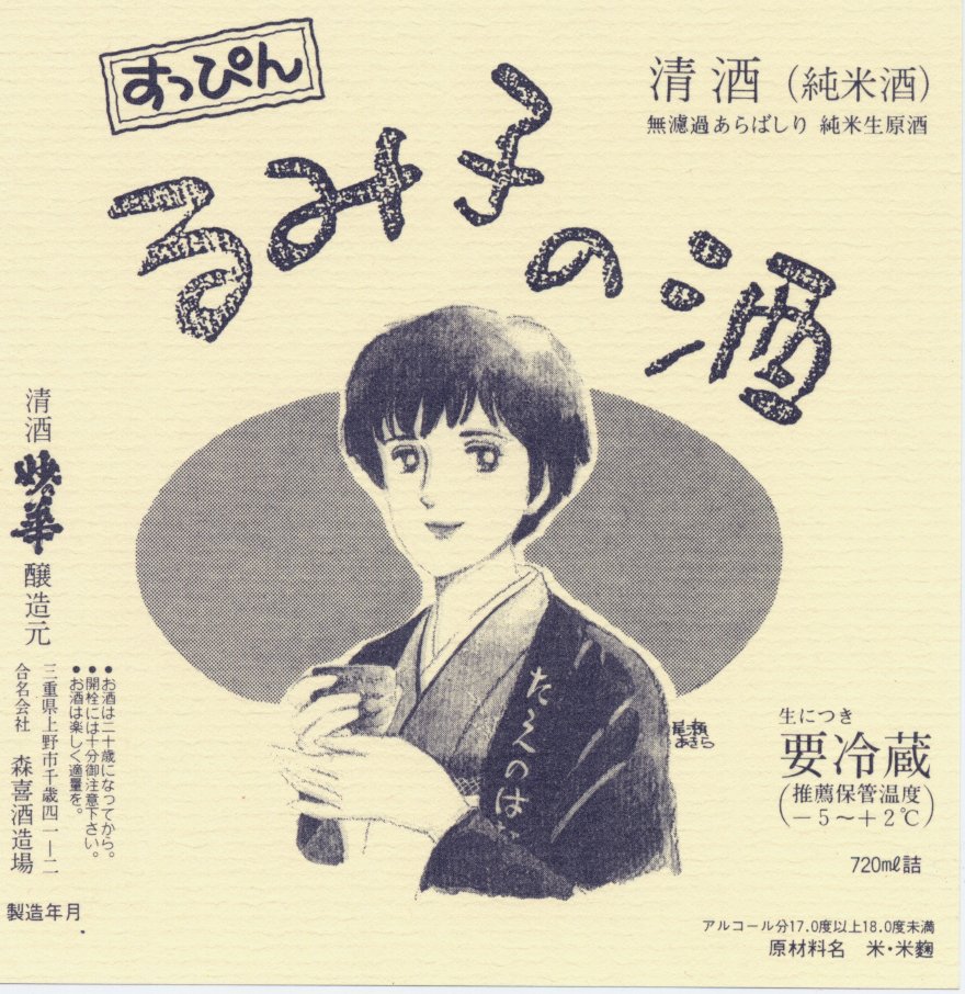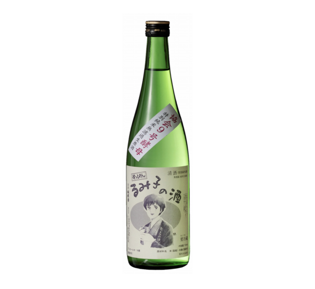 The label features an illustration of Rumiko Moriki, the brewery’s fifth-generation owner and former master brewer, drawn by manga artist Akira Oze, known for Natsuko no Sake.