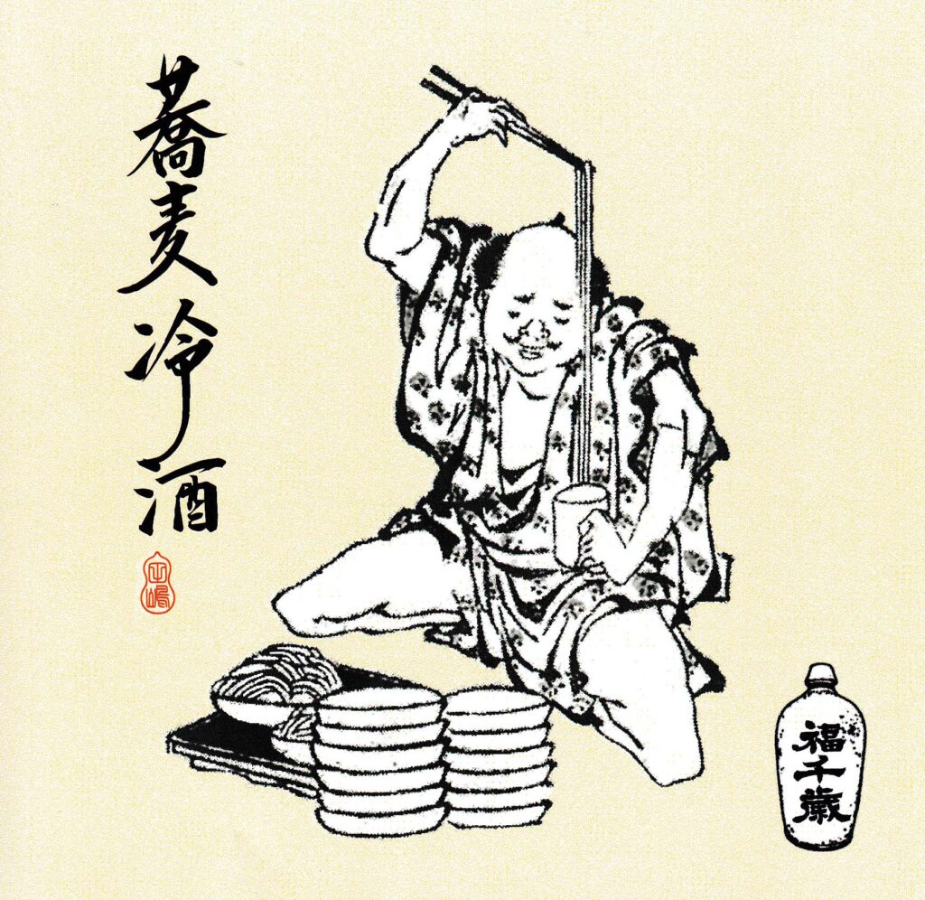 A sake designed to be chilled and accompany soba noodles. The label features artwork “Mugei taishoku” from Katsushika Hokusai’s Hokusai Manga.