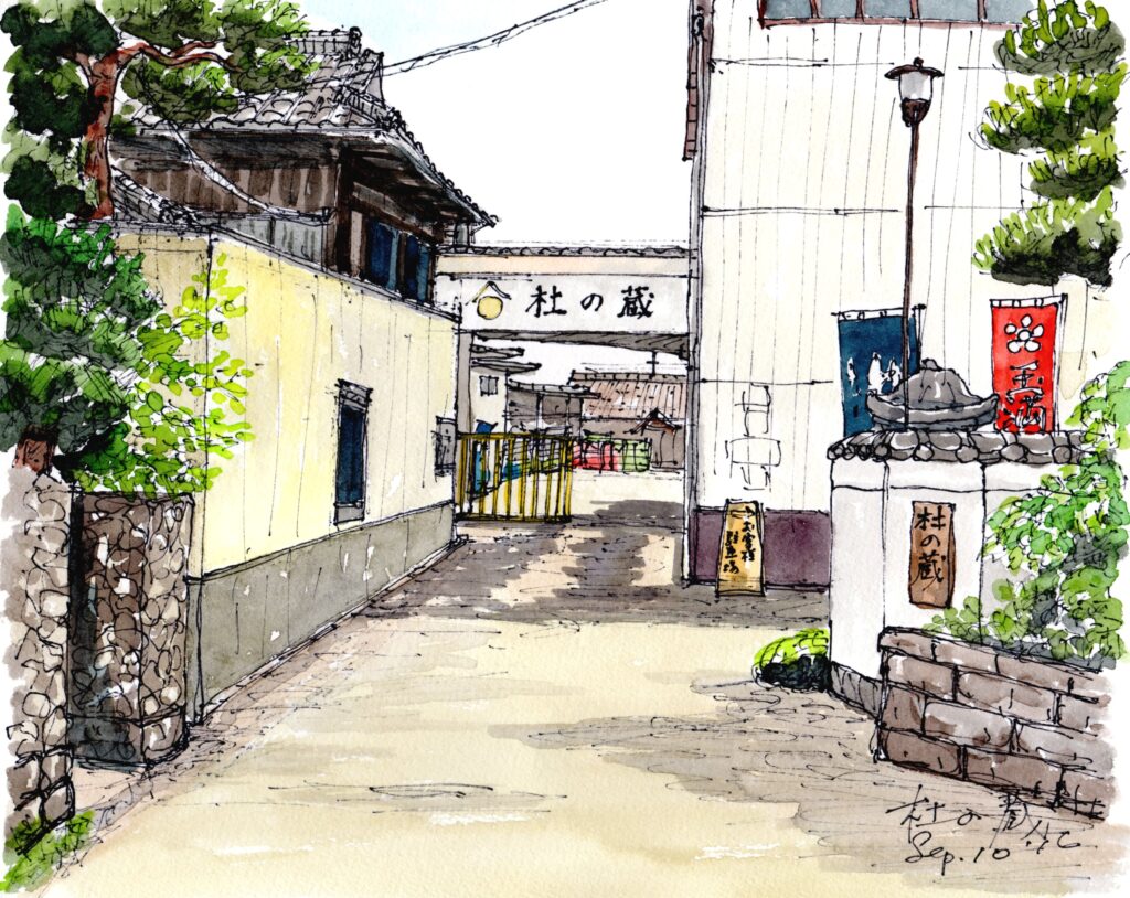 Artist’s Comment: A view from the front gate, showing a modern kura alongside an old main house.