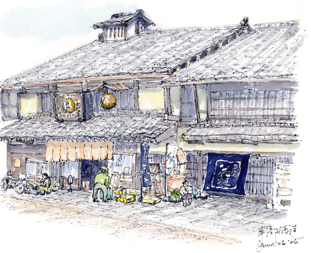 Artist: Chuichi KatoArtist’s Comment: Morning market stalls line up in front of a majestic kura.Painted: June 2006