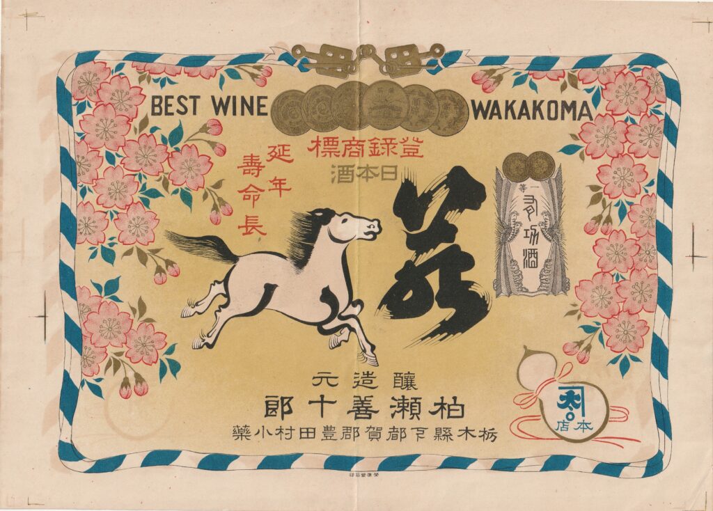 銘柄:若駒(わかこま)醸造元:柏瀬善十郎(かしわせぜんじゅうろう)場所:栃木県時代:明治容器:樽印刷方法:機械印刷サイズ:24 × 18cm