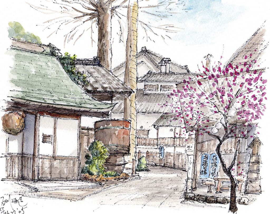 画家:加藤忠一画家コメント:樹齢四百年の夫婦欅。満開の紅梅が綺麗。作画:2005年2月