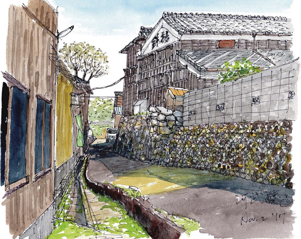 画家:加藤忠一画家コメント:酒銘のある蔵、売り物の石垣をモチーフにした。作画:2017年11月
