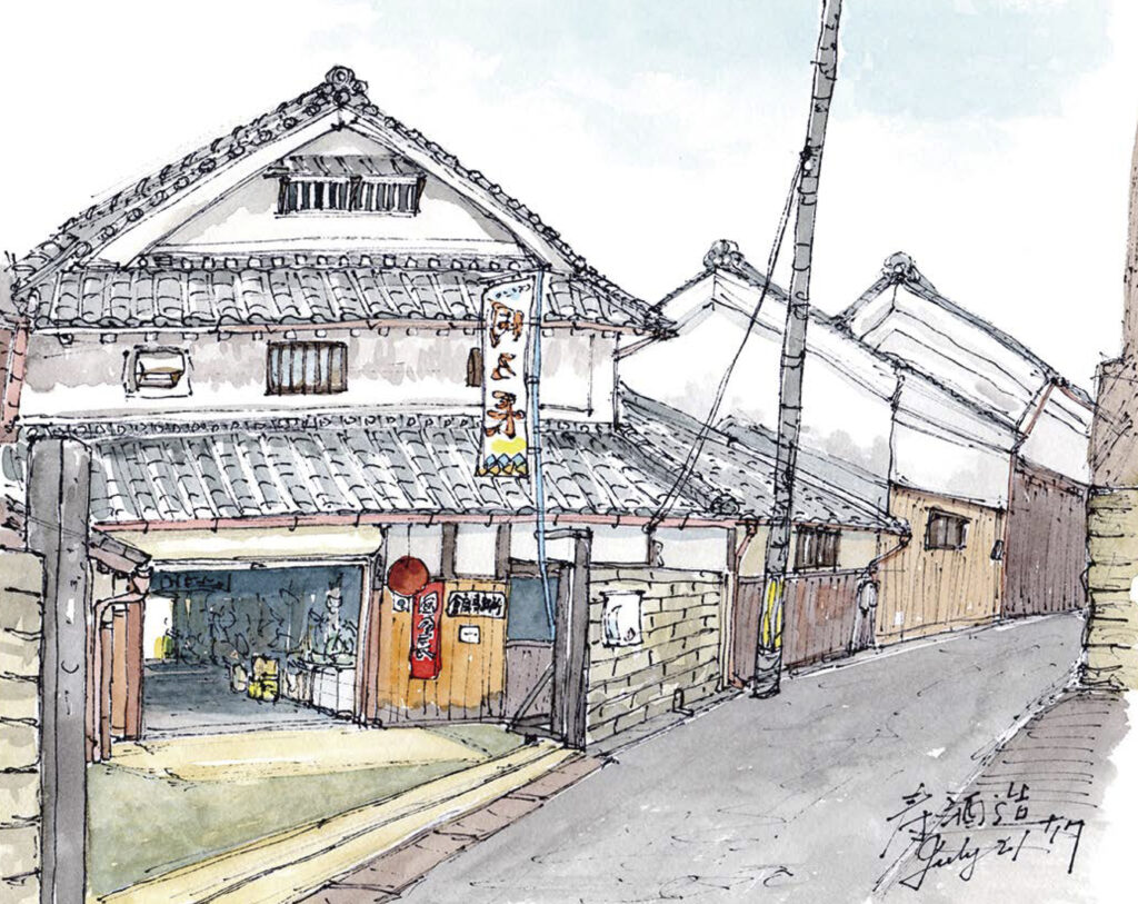 画家:加藤忠一画家コメント:1822年 狭い道に沿って蔵がある。若い蔵人達だ。作画:2017年7月