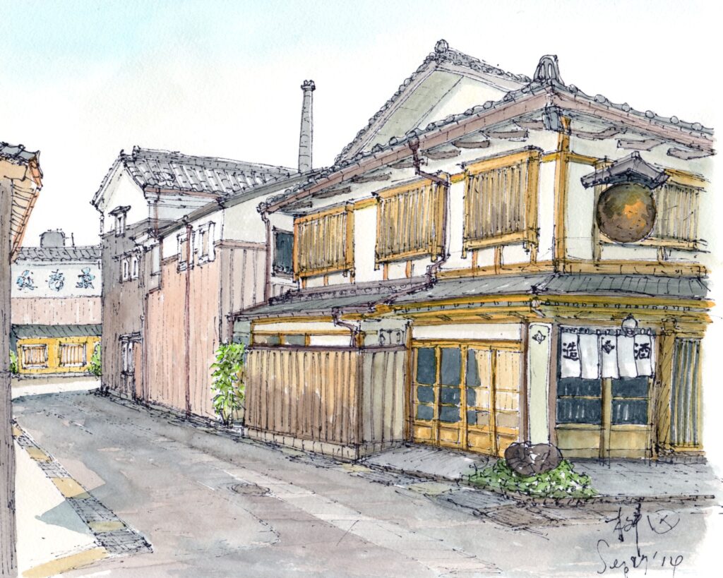 画家:加藤忠一画家コメント:美しい蔵だ。ふんだんに木が張ってある。作画:2014年9月