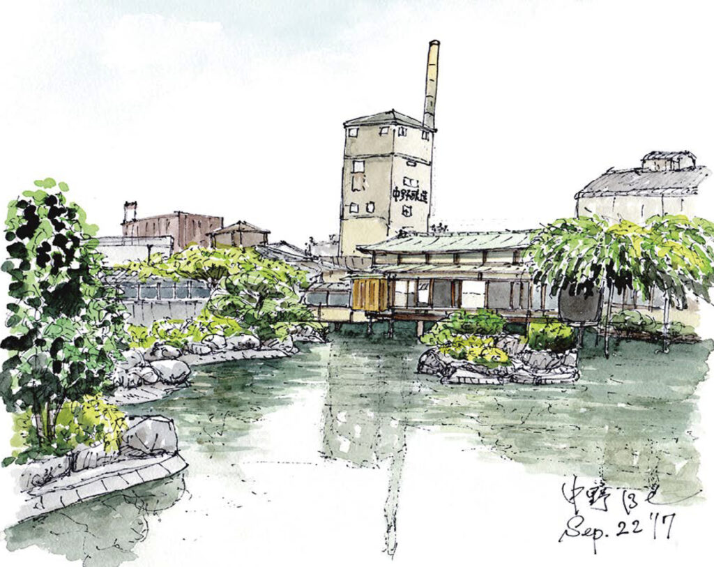 画家:加藤忠一画家コメント:見事な日本庭園から、蒸留塔を主役にした。作画:2017年9月