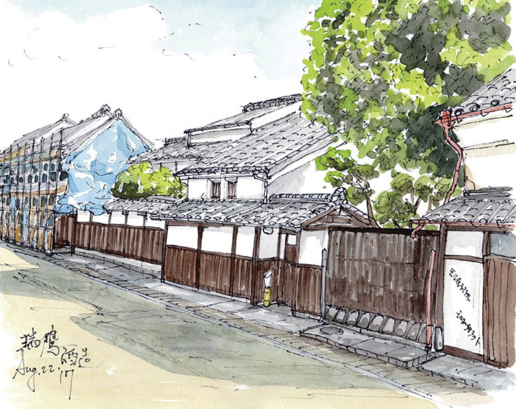 画家コメント:長い蔵は地震の傷みを修理中。大樹が映える。